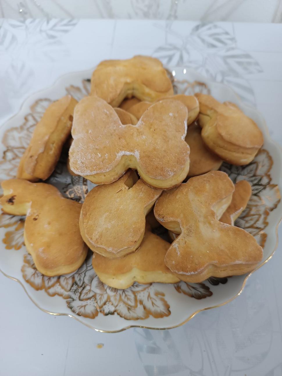 Нашла мамин блокнот, это печенье моего детства, 30 лет прошло, а вкус помнится... 3 яйца, 1 стакан сахара, 1ч.л.соды, 1 стакан кефира, 3/4 пачки маргарина растопленного(в 1 пачке- 250гр), 3-4 стакана муки( у меня ушло больше, примерно 5-6 ст, возможно из- за больших яиц). Полежало тесто минут 30, раскатывать не тонко, примерно 1 см толщиной. Я добавила ещё 0,5 ложки разрыхлителя и чуть ванилина.