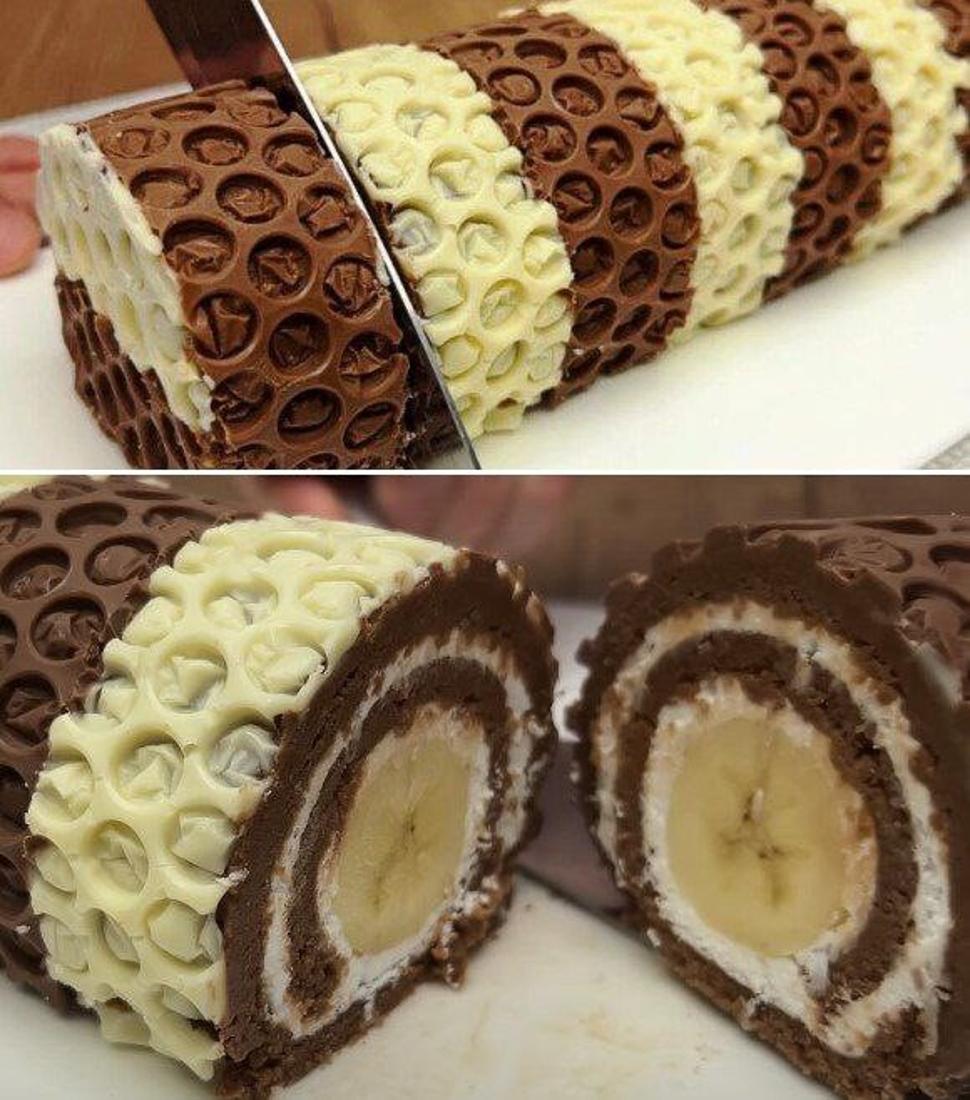 Сворачиваем пласт так, чтобы в итоге бананы находились внутри и в центре рулета.