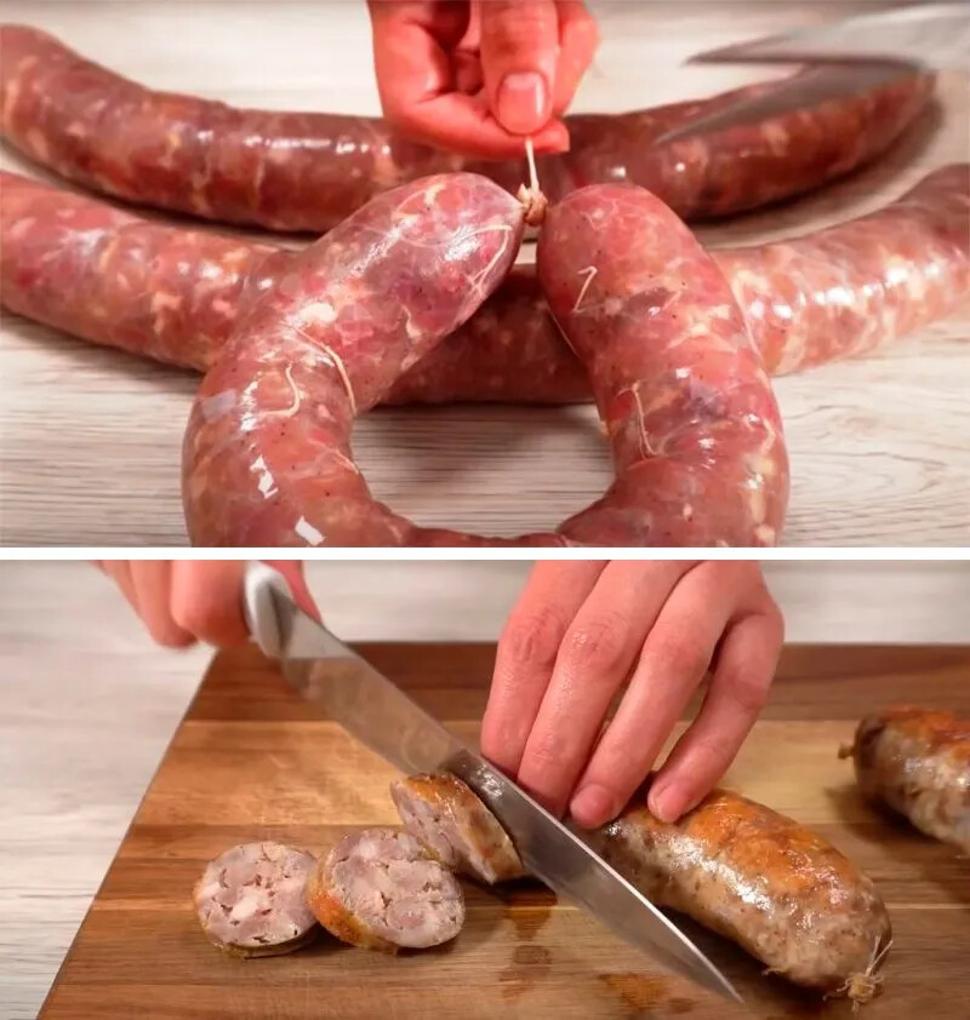 Перевязываем колбаски шпагатом и прокалываем их иголкой в нескольких местах.
