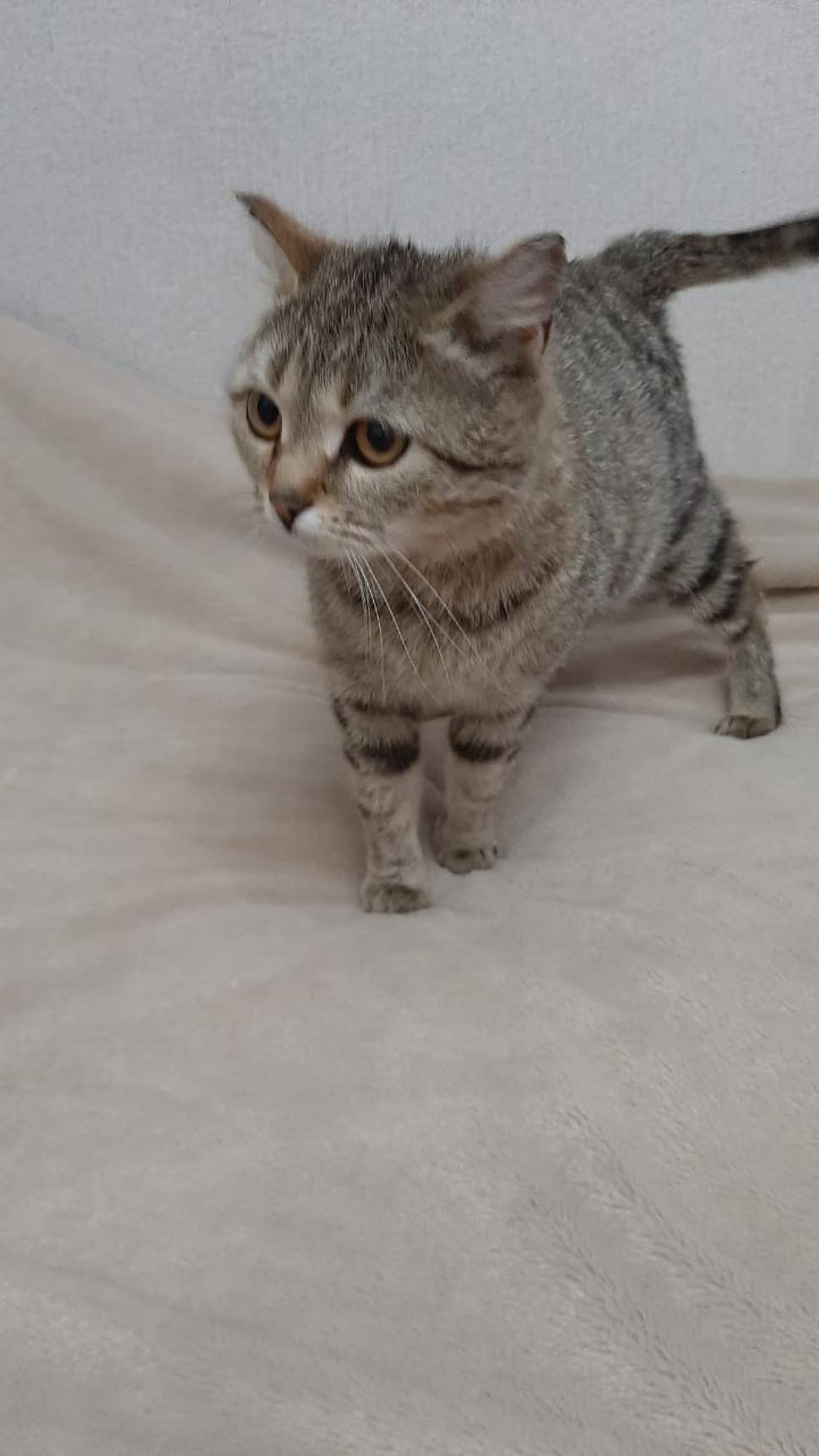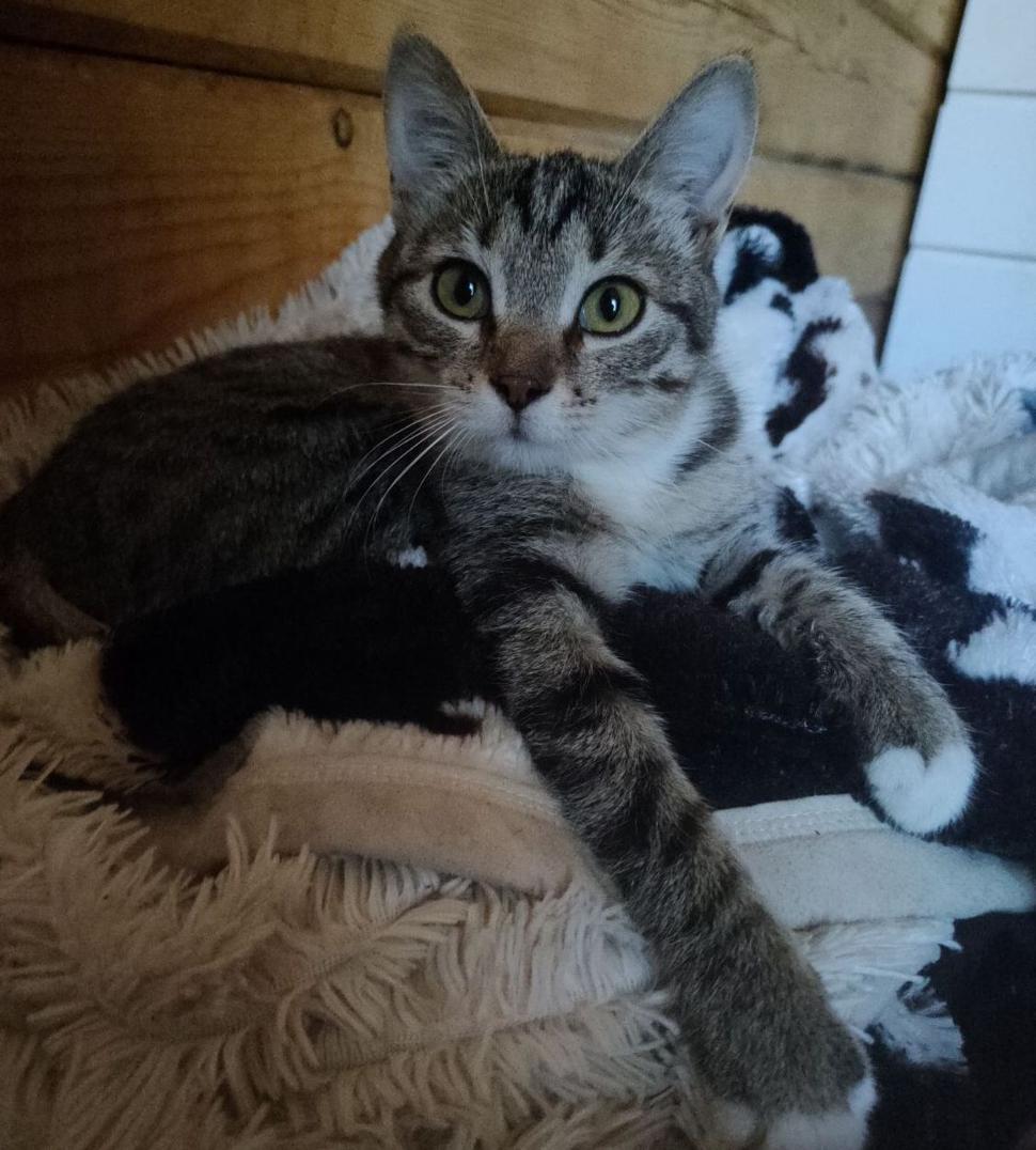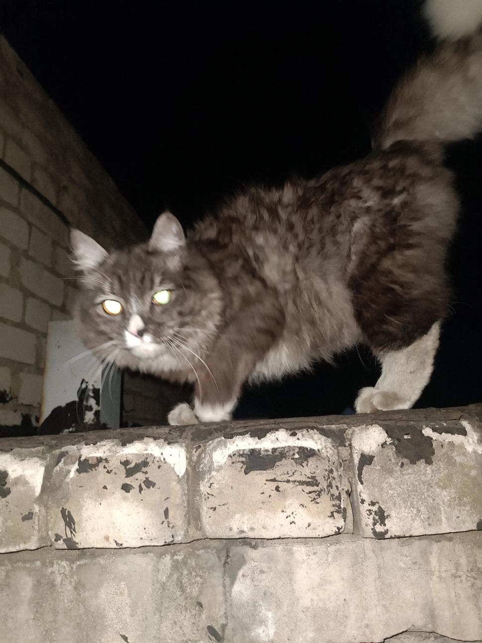 Котёнок - подросток. Очень добрый, ласковый. Недоверия ноль. Постоянно трется и ластится. Людей и других животных не боится. Собак в том числе.